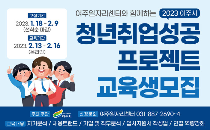 [로컬세계=김병민 기자]경기 여주시(시장 이충우)는 다음달 9일까지 여주일자리센터에서 2023 청년 취업성공 프로젝트 교육생을 모집한다고 26일 밝혔다.