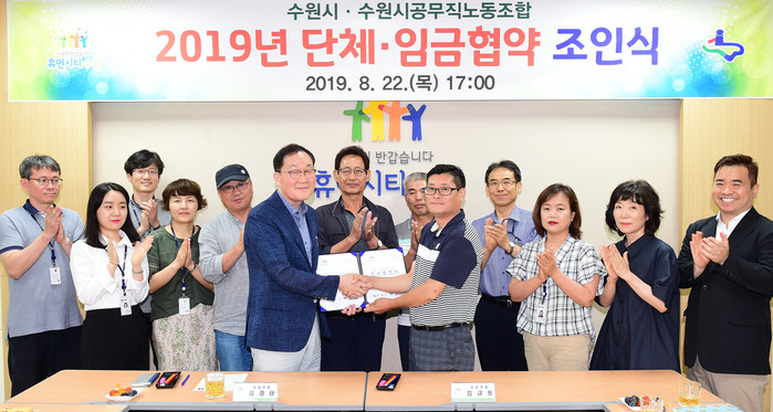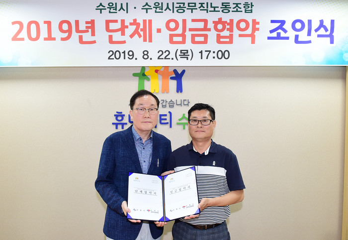 [로컬세계 고용주 기자]경기 수원시와 수원시공무직노동조합은 22일 임금 2.0% 인상, 배우자 출산휴가 기간 확대, (간부) 조합 활동 시간 조정 등을 골자로 하는 ‘2019 임금·단체협약’을 체결했다고 밝혔다.