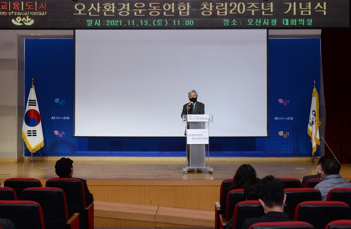 | ▲곽상욱 오산시장이 지난 13일 오산환경운동연합은 창립 20주년 기념식에서 축사를 하고 있다. 오산시 제공 |