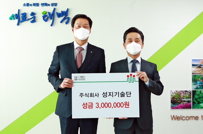 [로컬세계 박상진 기자]강원 태백시는 5일 ㈜성지기술단(이사 황용해)에서 태백시청을 방문해 '희망2021 나눔캠페인' 이웃돕기 성금 300만원을 기탁했다고 밝혔다.