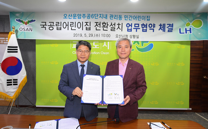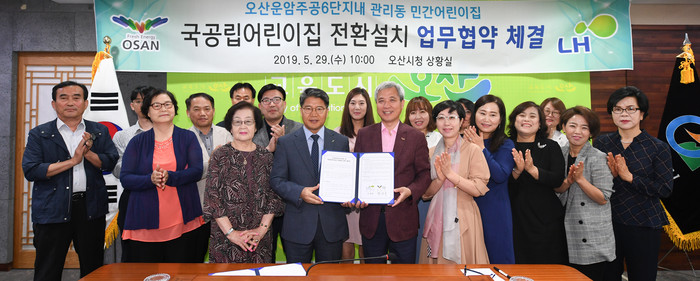 오산시는 29일 LH 장충모 경기지역본부장이 참석한 가운데 시청 상황실에서 보육의 공공성 강화와 보육서비스 질적 향상을 위해 올 하반기 오산운암주공6단지 내 관리동 어린이집을 국공립어린이집으로 전환 설치하는 내용의 업무협약을 맺었다.