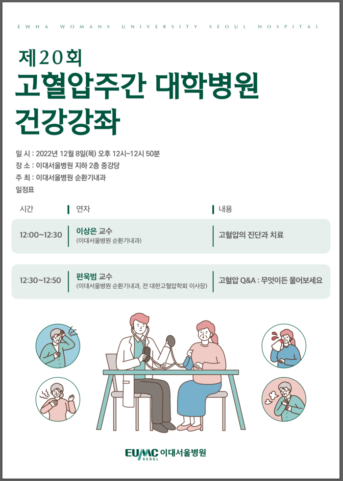 이대서울병원(병원장 임수미)은 오는 8일 오후 12시 이대서울병원 지하 2층 중강당에서 '제 20회 고혈압주간 대학병원 건강강좌'를 개최한다.