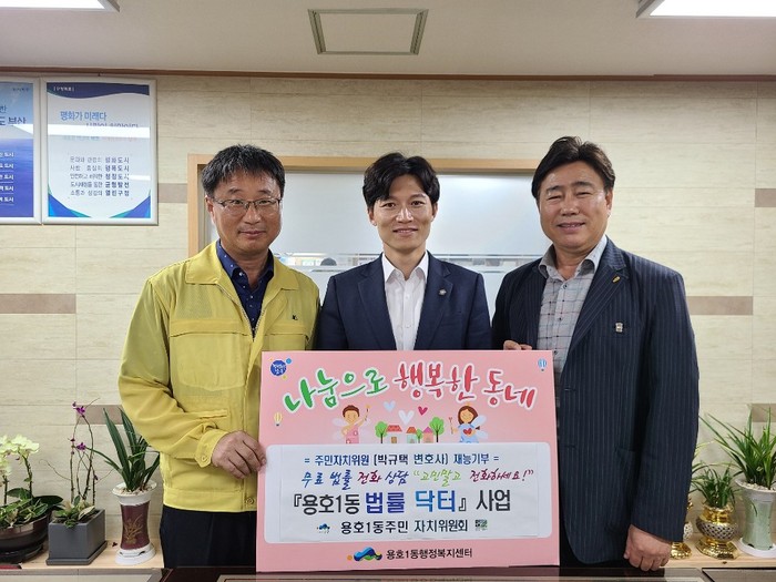‘용호1동 법률 닥터’는 용호1동 주민자치위원회의 특화사업으로 법률 자문을 받기 어려운 주민들을 위해 변호사 출신 주민자치위원 박규택 변호사(소속 : 법무법인 세진)의 재능기부로 진행될 예정이다.