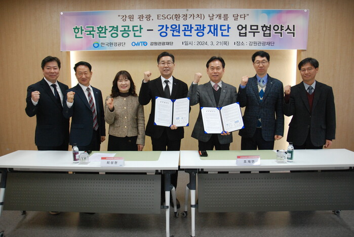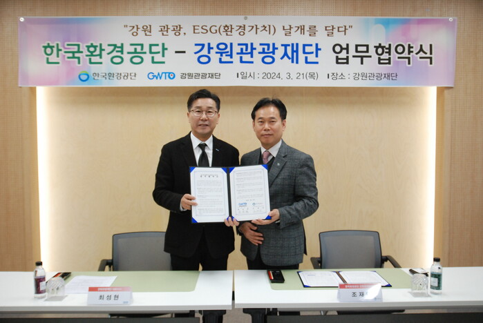 (재)강원관광재단(대표 최성현)과 한국환경공단 강원본부(본부장 조재연)가 21일 ‘강원 관광 ESG(환경가치)사업 활성화’를 위한 업무협약을 체결했다.