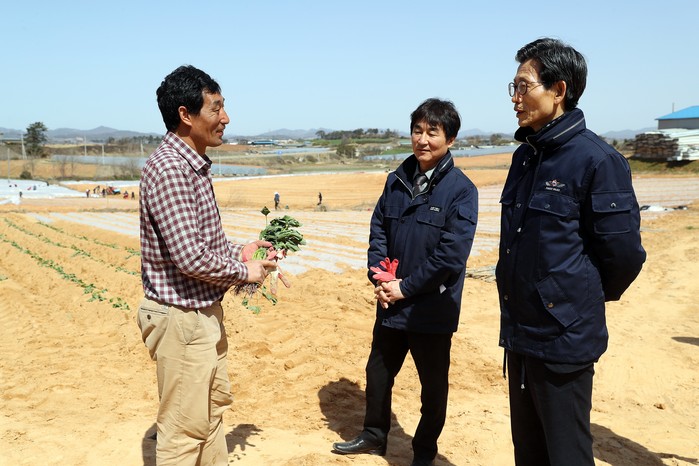 [로컬세계 김경락 기자]유기상 고창군수가 20일 고창군 대산면 율촌리 일대 고구마 첫 정식 현장을 방문해 재배 농가를 격려했다.