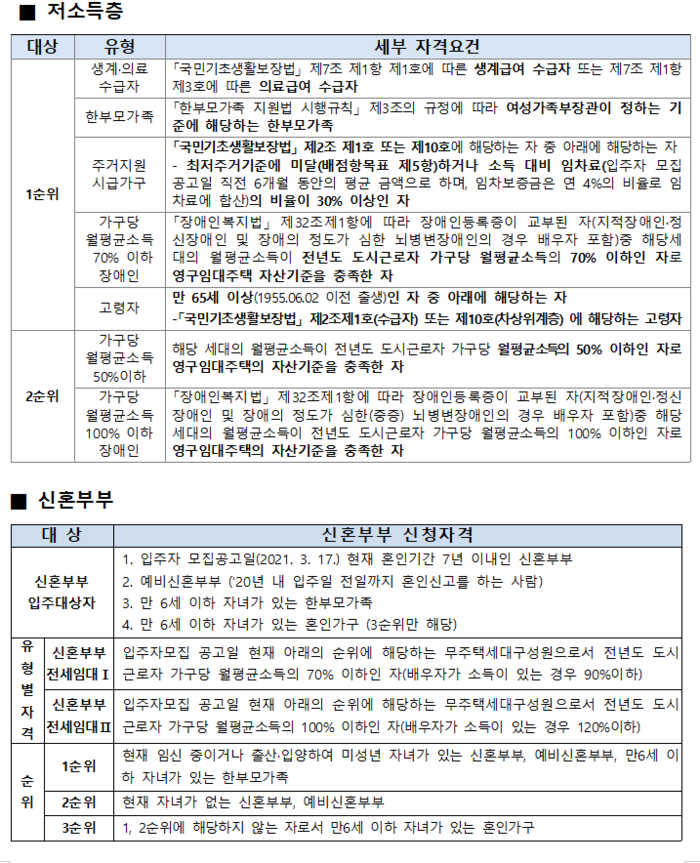 저소득층의 경우 1순위는 생계·의료수급자, 한부모가족, 주거지원시급가구, 전년도 도시근로자 가구당 월평균소득 70%이하인 장애인, 고령자이다.