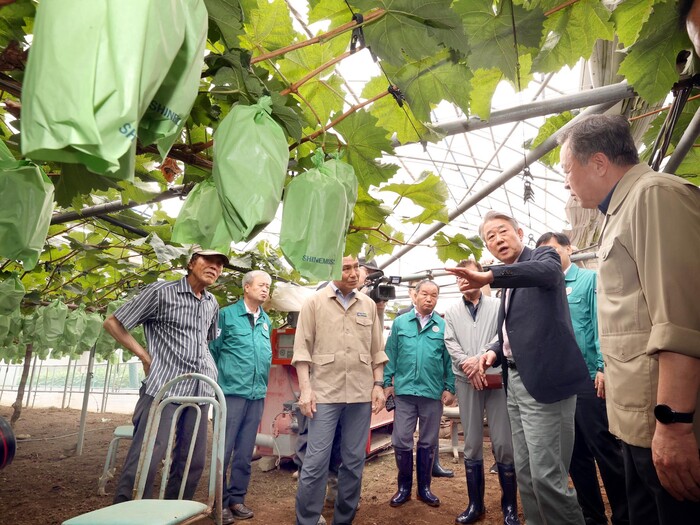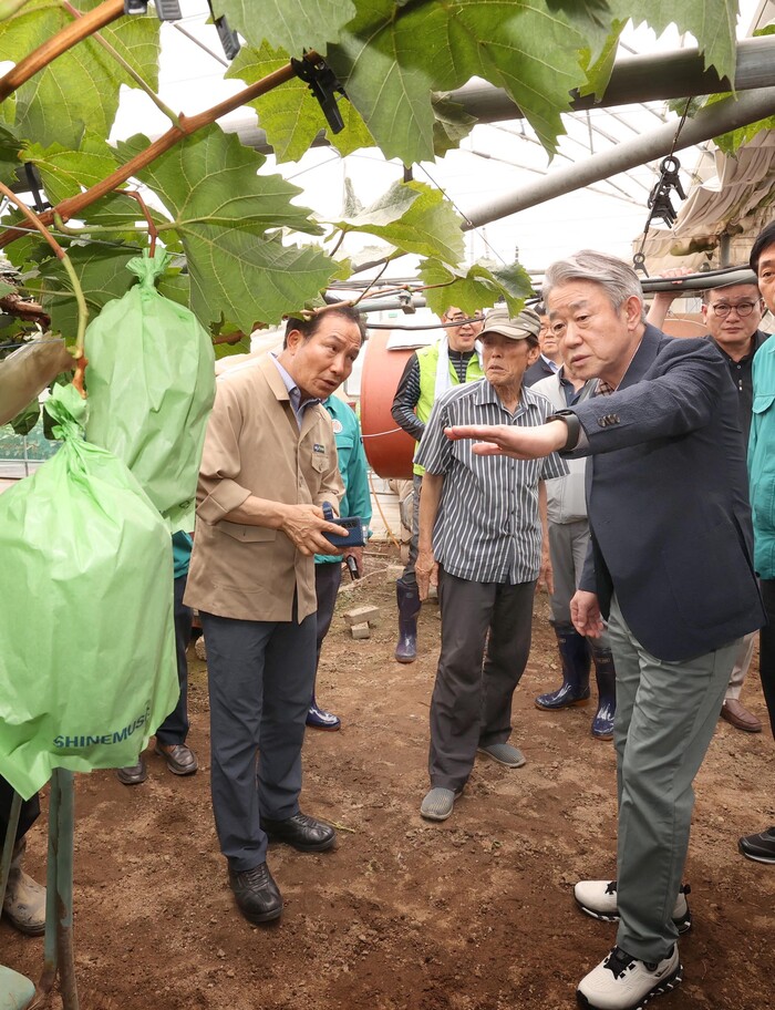 ▲강호동 농협중앙회장(오른쪽 두번째)이 17일 집중호우 피해를 입은 충북 영동군 포도농장을 방문하여 현장의견을 청취하고 피해농가를 위로하고 있다. |