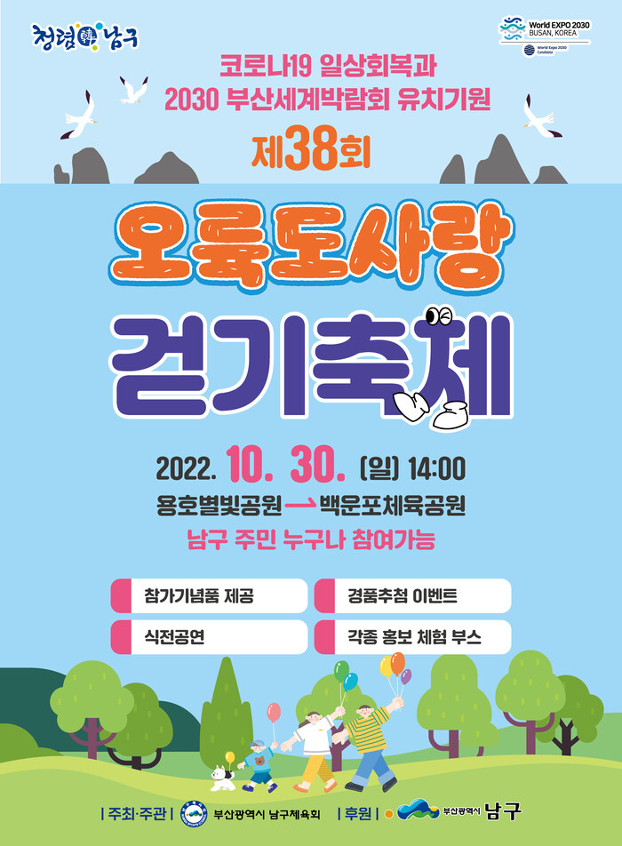 특히, 이번 걷기축제는 코로나19 일상회복과 2030부산세계박람회 유치 기원을 주제로 출발지인 용호별빛공원에서 다양한 이벤트가 펼쳐진다.