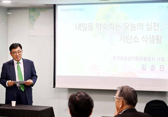 ▲제3기 2024 ESG경영아카데미 현장사진. 강연중인 한국농수산식품유통공사 김춘진 사장 |