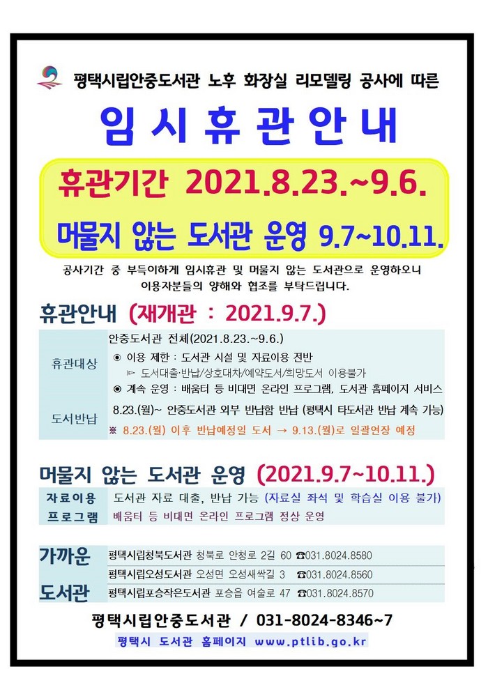 임시휴관중에는 도서관 시설 및 자료실 운영이 전면 중단된다. 이에 따라 대출한 도서는 9월 7일 재개관전까지는 안중도서관 외부 반납함 및 지산초록도서관(9.15. 재개관)을 제외한 평택시 12개 도서관에서 반납이 가능하다. 휴관기간 중 독서문화 프로그램은 온라인을 통해 정상적으로 진행될 예정이니 도서관 홈페이지를 참고하면 된다.