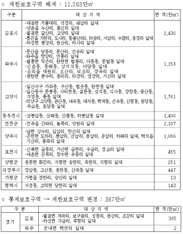 경기도는 김포, 연천, 고양 등 도내 112㎢(3,314만평) 규모의 토지가 군사시설보호구역에서 해제된다고 5일 밝혔다.