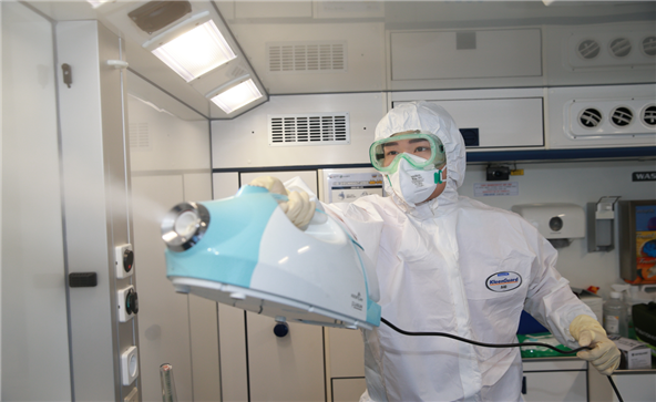 ▲119전담구급대원이 감염관리실 소독에 나서고 있다. |