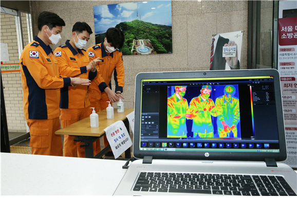 ▲소방재난본부 청사 입구에 설치된 열화상카메라를 통해 출입자의 체온을 확인하고 있다. |