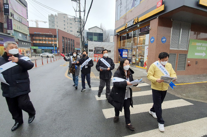 | ▲25일 오후석 제1부시장과 관계 공무원 등이 백신 접종 안내문을 배포를 위해 외국인들이 많이 거주하고 있는 처인구 중앙동 일대를 걷고 있다. 용인시 제공 |
