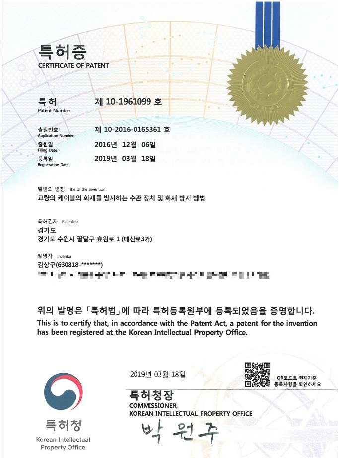 그러면서 “이번 특허가 낙뢰 또는 교량위 차량화재로 인한 복사열로 인해 발생할 수 있는 교량 케이블 화재사고 예방에 큰 도움이 되기를 기대한다”고 말했다.