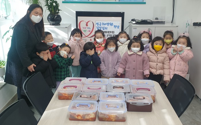 대구 수성구 구립상화어린이집(원장 은순향)은 지난 1일 어려운 이웃에게 전해달라며 어린이집 원생들이 직접 만든 김장김치 13통과 교직원들이 모은 성금 50만 원을 상동 행정복지센터에 기탁했다.(사진=대구 수성구 제공)