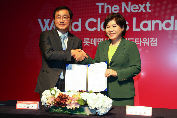 ▲4일 롯데월드타워 시네마 3관에서 조은희 서초구청장(오른쪽)과 이홍균 롯데면세점 대표가 업무협약을 체결하고 있다. |