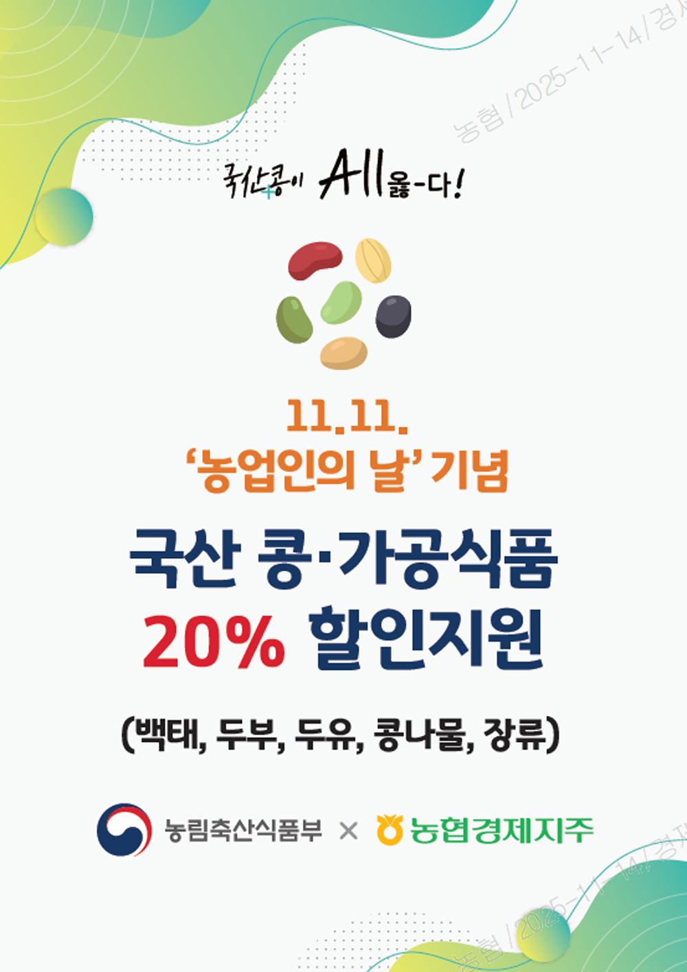 이번 행사는 11월 11일‘농업인의 날’을 기념하여 국산 콩 소비 감소로 어려움을 겪는 재배 농가를 지원하기 위해 농림축산식품부와 농협경제지주가 공동으로 마련했다.
