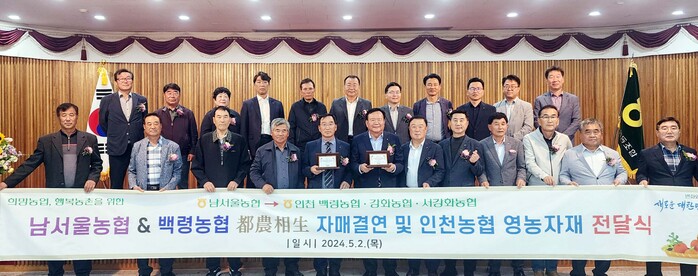 남서울농협은 도농상생 실천의 일환으로 백령농협에 무이자선급금 8억원, 1천만원 상당의 맞춤형 영농자재와 백령농협 숙원사업지원의 일환으로 400만원 상당의 회의실 빔프로젝터를 전달하였다.