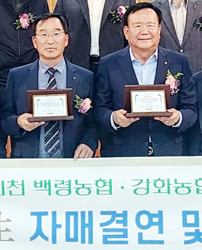 ▲남서울농협(조합장 안용승)과 백령농협(조합장 최형묵)간의 도농상생 자매결연 행사가 2일, 백령농협 대강당에서 개최되었다. (왼쪽부터) 백령농협 최형묵 조합장, 남서울농협 안용승 조합장 |