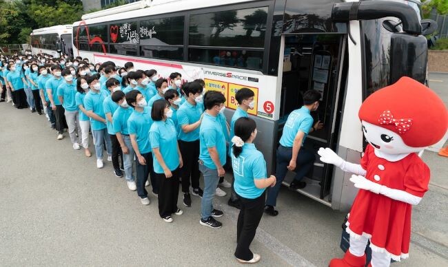 ▲ 신천지예수교 청년자원봉사단체인 ‘위아원’ 회원들이 지난 9월 '7만명 단체헌혈'에 동참하기 위해 단체로 부산혈액원으로 향하는 버스에 오르고 있다. 위아원 제공 |