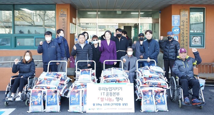 서을구 농협 우리농업지키기운동본부 IT지역본부장(앞줄 오른쪽 두번째)과 이소영 국회의원(앞줄 오른쪽 네번째)이 의왕시 장애인협회를 찾아 사랑의 쌀을 전달한 후 기념촬영을 하고 있다.