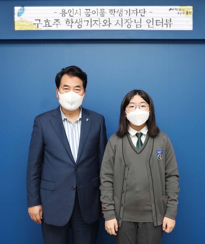 이날 용인시청 시장실에서 진행된 인터뷰는 용인시 최초 학생기자단인 꿈이룸 학생기자단의 구효주(성복중 2년) 기자의 요청으로 진행됐다.