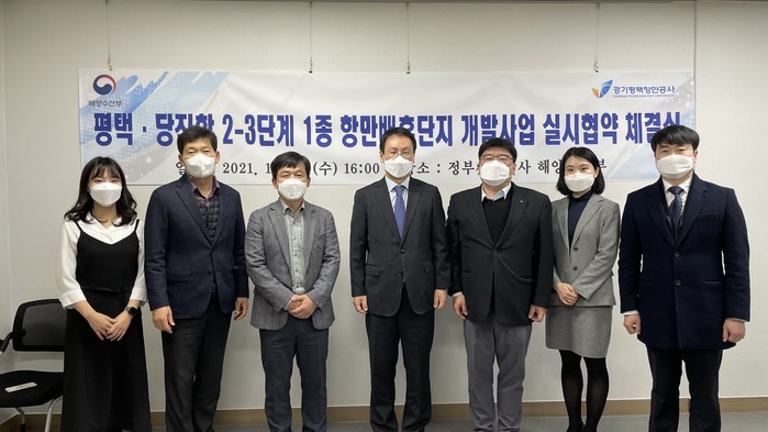 | ▲김창균 해양수산부 항만국장(왼쪽에서 네번째)과 황두건 경기평택항만공사 사업개발본부장 직무대행(왼쪽에서 다섯 번째) 등 관계자. |