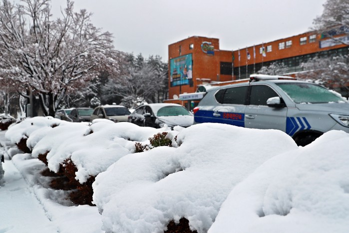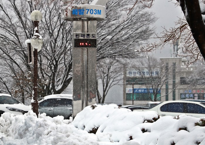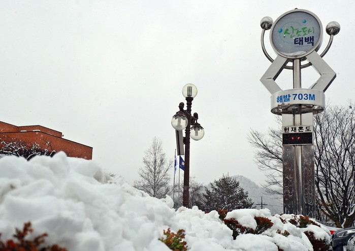 설 연휴 마지막 날인 27일 오후 3시 강원 태백시에 대설주의보가 발효되면서 내린 눈으로 28일 태백시청 주변이 온통 눈으로 뒤덥혀 있다. 태백시에 내려진 대설주의보는 28일 오후 12시 30분부로 해제됐으며, 당일 적설량은 12.8cm로 기록됐다.(사진=태백시 제공)