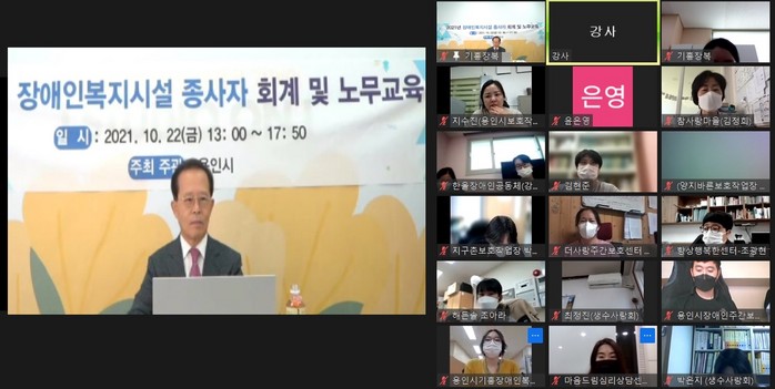 | ▲용인시가 22일 화상회의 앱인 줌(ZOOM)으로 진행한 장애인복지시설 종사자 대상 회계·노무 교육 모습. 용인시 제공 |