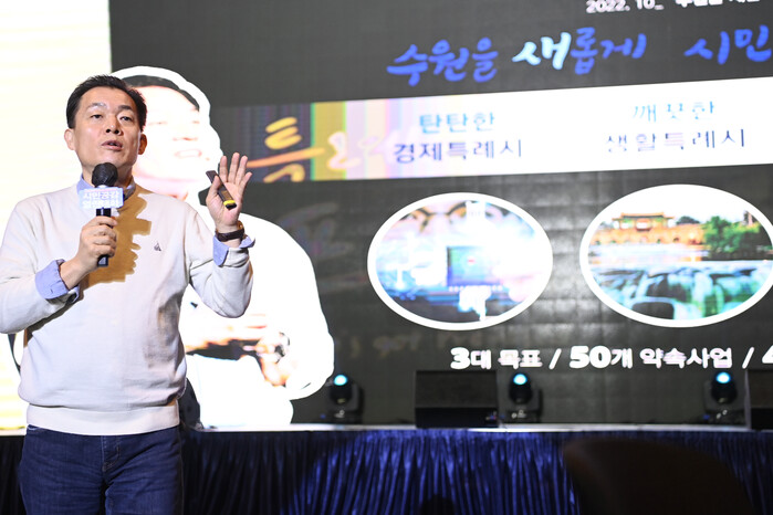 ▲ 이재준 수원시장이 2023년 시민공감 열린대화에서 올해 시정계획을 설명하고 있다. 수원시 제공 |