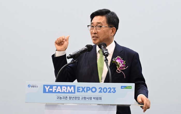 ▲ Y-Farm Expo 2023 개막식 현장 사진. 축사하는 한국농수산식품유통공사 김춘진 사장. |