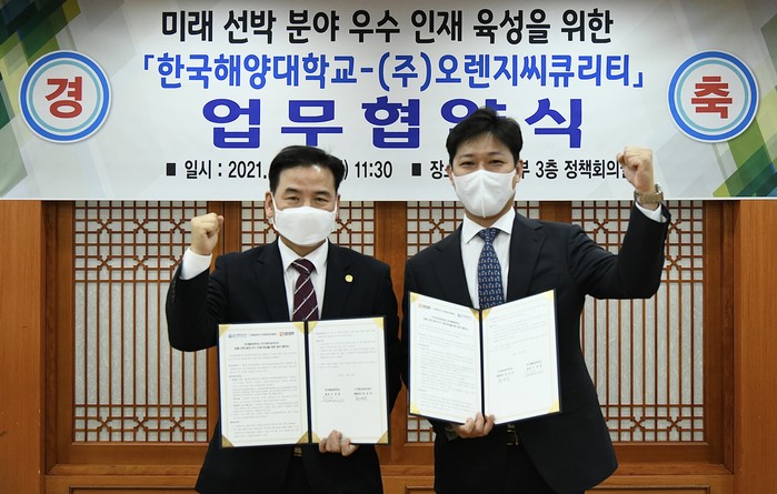 한국해양대학교(총장 도덕희)는 ㈜오렌지씨큐리티(대표이사 최성민)와 ‘미래선박분야 우수인재 육성을 위한 업무협약식’을 대학본부 3층 정책회의실에서 25일 개최했다고 밝혔다.