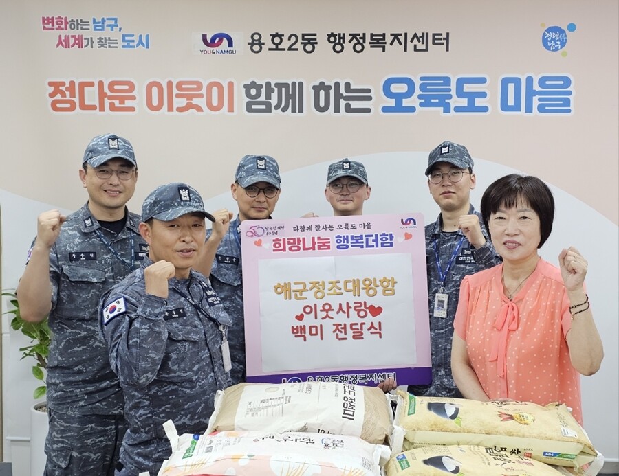 [로컬세계 = 맹화찬 기자] 기동함대사령부 정조대왕함이 14일 부산 남구 용호2동 행정복지센터에 관내 어려운 이웃을 위한 백미 20포를 기부했다.