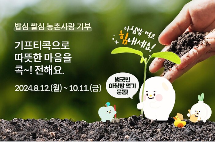 「밥심 쌀심 농촌사랑 기부」이벤트는 1,200만 고객이 NH콕뱅크에서 쌓은 비현금성 활동점수인 기프티콕을 사회공헌 콘텐츠에 사용하면 농협이 고객을 대신해 기부하는 서비스로, 고객이 사용한 기프티콕 점수를 기반으로 구간별 조건에 따라 농협에서 농촌에 거주 중인 취약계층에게 쌀 가공품을 기부하는 행사이다.