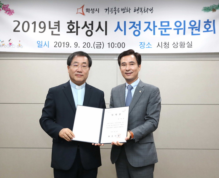 | ▲시정자문위원 위촉장 수여 모습. 왼쪽부터 송경용 신부, 서철모 화성시장.(화성시 제공) |