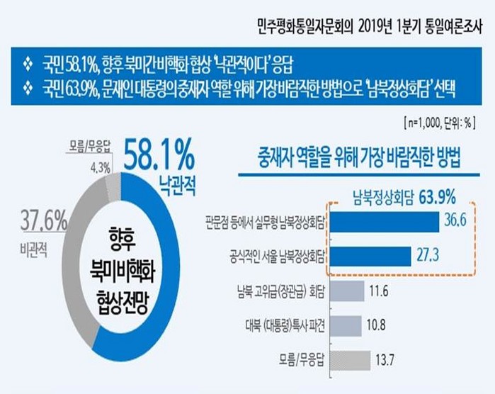 남북관계 현안 조사결과, 국민 10명 중 6명은 하노이 회담 직후 트럼프 대통령이 문재인 대통령에게 요청한 중재자 역할과 관련 현 시점에서 ‘남북정상회담’(63.9% = 판문점 등 실무형 정상회담 36.6% + 공식적 서울 정상회담 27.3%)을 바람직하게 생각하는 것으로 나타났다.