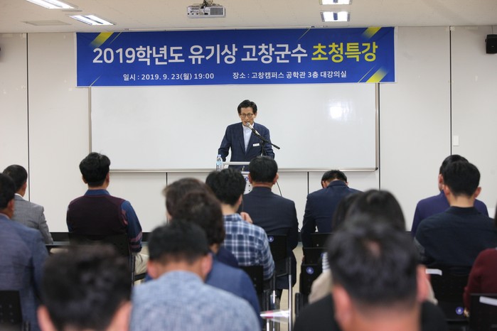 ▲유기상 군수가 지난 23일 전북대학교 고창캠퍼스에서 특강을 펼치고 있다.(고창군 제공) |