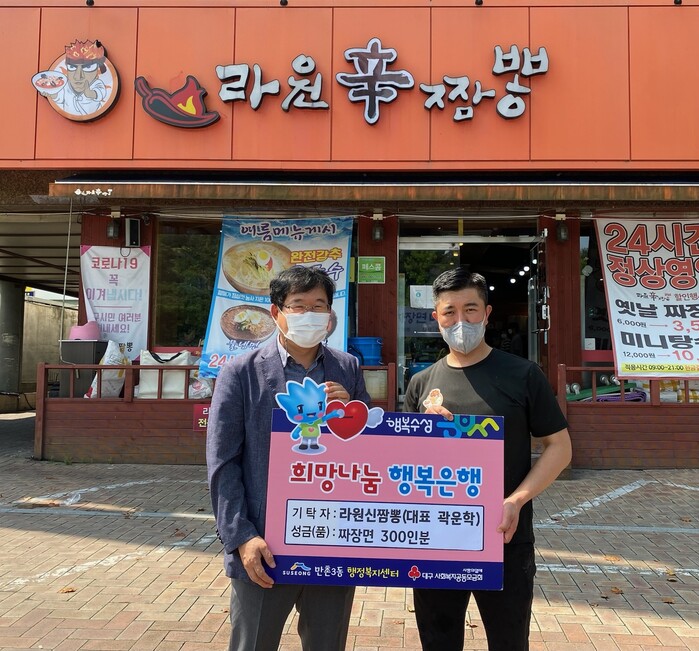 [로컬세계=박세환 기자] 대구 수성구 만촌3동에 있는 라원신짬뽕(대표 곽운학)은 25일 취약계층 어르신 300여 분에게 자장면을 무료로 대접하는 ‘자장면 나눔 행사’를 개최했다.