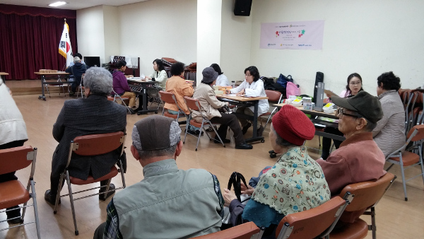 ▲마포구보건소 관계자들이 어르신들을 대상으로 치매검진을 하고 있다. |