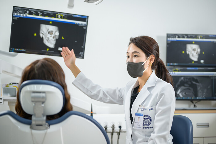 ▲구강외과 홍성옥 교수가 한 환자에게 치과에서 시행하는 다양한 수면무호흡증 치료법에 대해 설명하고 있다. |