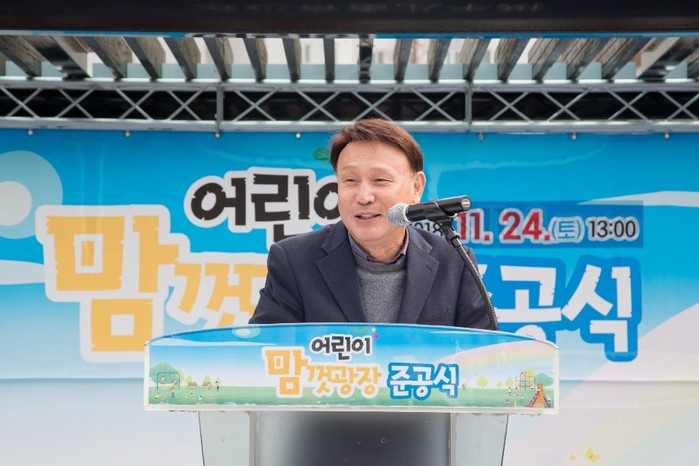 ▲강임준 군산시장이 ‘어린이 맘껏광장’ 준공식에서 인사말을 하고 있다.(군산시 제공) |
