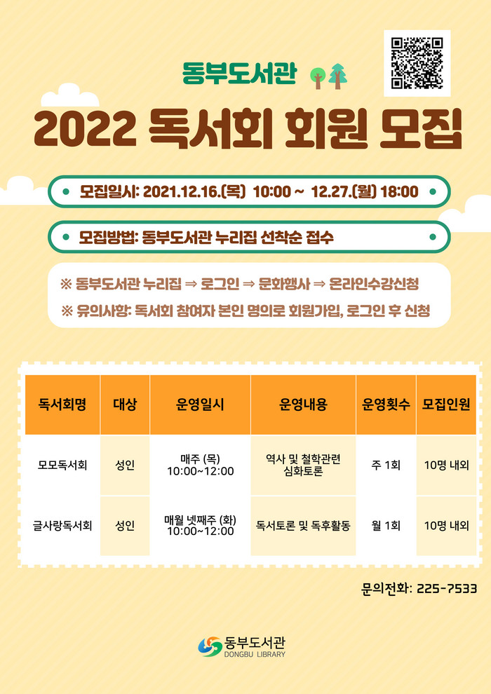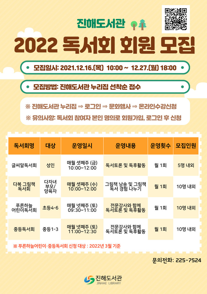 진해도서관은 초등(4-6학년 대상), 중등(1-3학년 대상), 성인 일반, 다자녀 부모 또는 양육자를 대상으로 하는 4개 독서회 회원을 모집하고, 동부도서관은 2개 성인 독서회 회원을 모집한다. 초등과 중등 독서회 신청 대상은 2022년 3월 기준 학년이다.