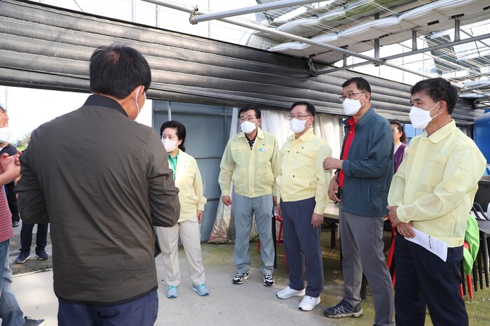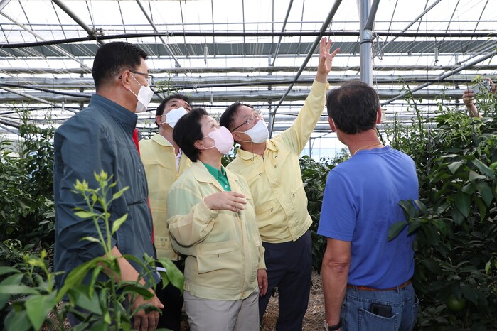 홍 시장은 이날 김영선 국회의원과 함께 시설농가 등을 둘러보며 꼼꼼히 살폈다.