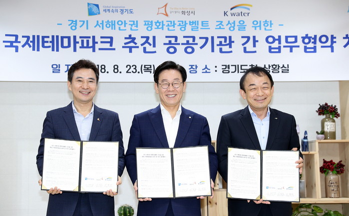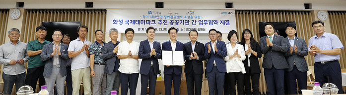 이재명 경기도지사, 서철모 화성시장, 이학수 한국수자원공사 사장은 경기도청에서 국제테마파크 정상화를 위한 협약서에 서명하고 협약식에 참석한 주민들과 화성 국제테마파크의 성공적 추진을 다짐했다.
