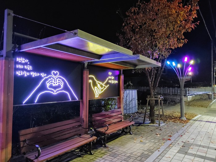 쉼터공간에는 감성 문구 및 로고가 표현된 LED 조형물과 로고젝터를 설치하고 의성교 등 통행구간에는 보행자와 운전자에 눈부심이 없는 주변 환경과 조화되는 경관조명을 설치했다.