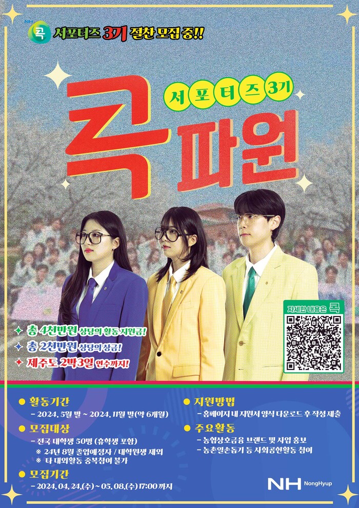 농협(회장 강호동) 상호금융은 SNS활동을 통해 상호금융의 주요사업을 홍보하고 농업·농촌의 가치를 전파할 대학생 홍보단「NH콕서포터즈」3기 50명을 지난 4월 24일부터 5월 8일까지 모집한다.