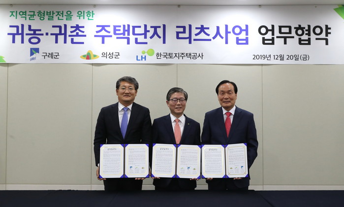 [로컬세계 박상진 기자]경북 의성군은 20일, 진주 LH본사에서 김주수 의성군수와 변창흠 한국토지주택공사 사장을 비롯한 관계자들이 참석한 가운데 LH와 ‘귀농·귀촌 주택단지 리츠사업을 위한 업무협약(MOU)’을 체결했다.