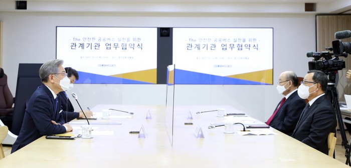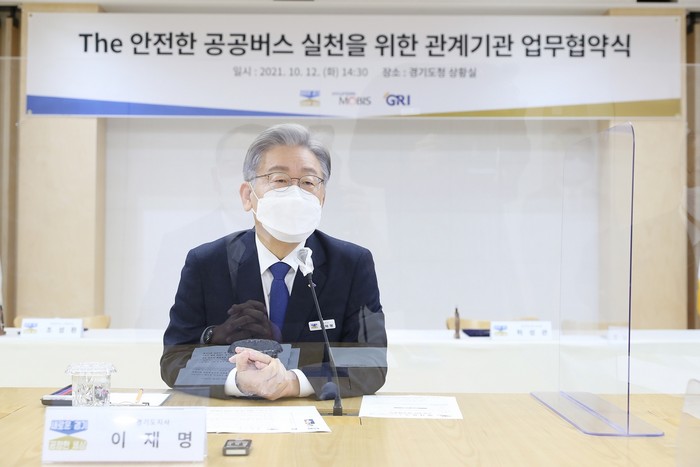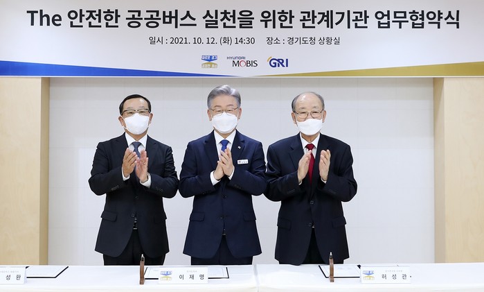 이재명 경기도지사는 12일 오후 경기도청 상황실에서 조성환 현대모비스 대표이사, 허성관 경기연구원 이사장과 이 같은 내용의 ‘The 안전한 공공버스 실천을 위한 관계기관 업무협약’을 체결했다.