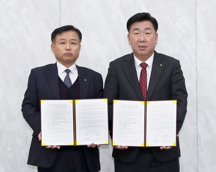 ▲ 김경수 농협사료 대표(왼쪽)와 이범석 청주시장(오른쪽)이 청주시 하이테크밸리 산업단지 투자협약 체결 후 기념촬영을 하고 있다. 농협사료 제공 |